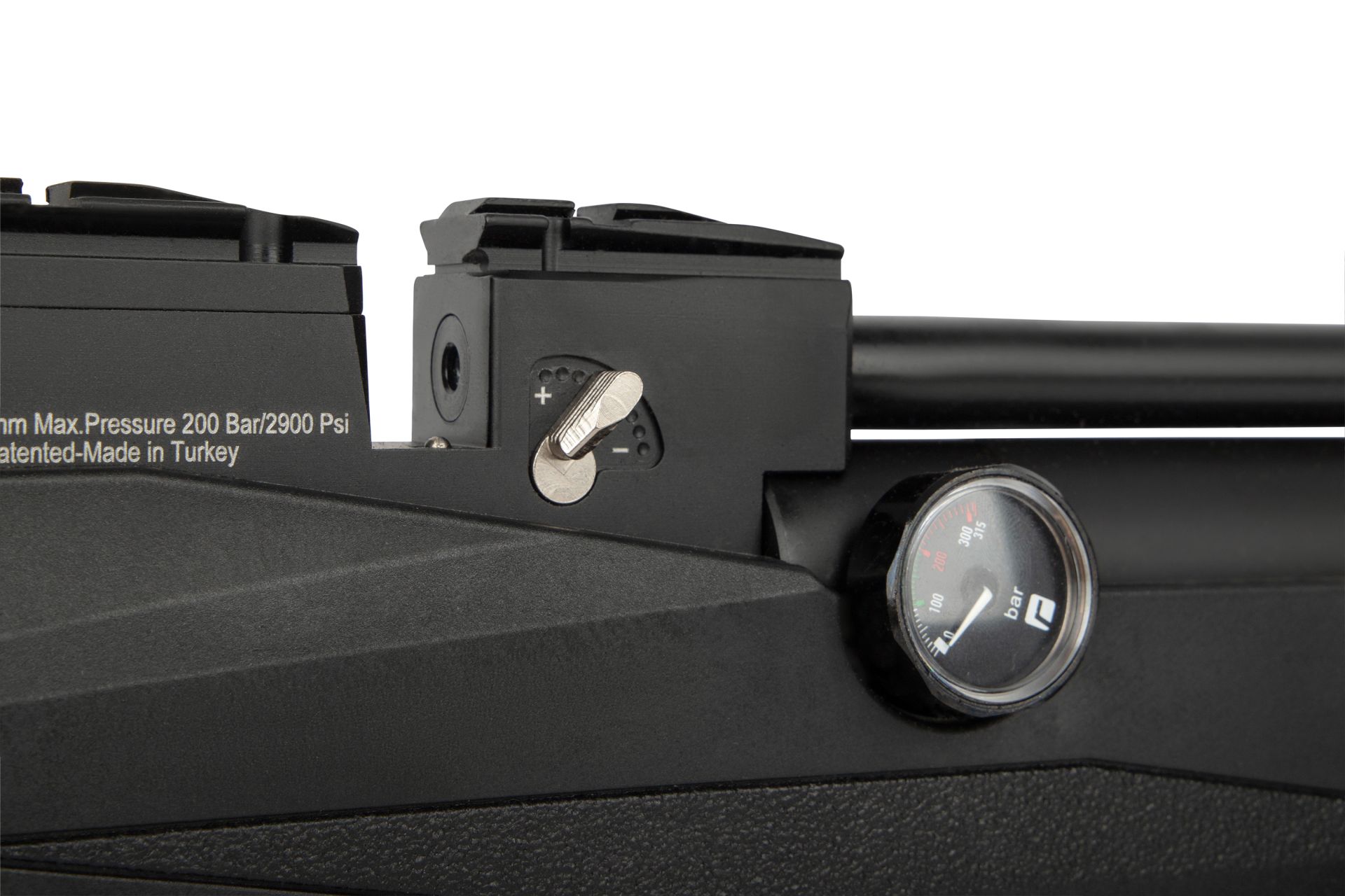 Das Seitenhebel-Repetiersystem ermöglicht schnelle und präzise Schussfolgen. Zwei Magazine sowie ein Single-Shot-Tray sind im Lieferumfang enthalten. Das Gewehr verfügt über Montageschienen (11 mm Prismenschiene + 22 mm Picatinny) für Optiken, Zweibein oder weiteres Zubehör. Ein integriertes Manometer und ein einstellbarer Abzug erhöhen die Funktionalität und Bedienungskomfort.