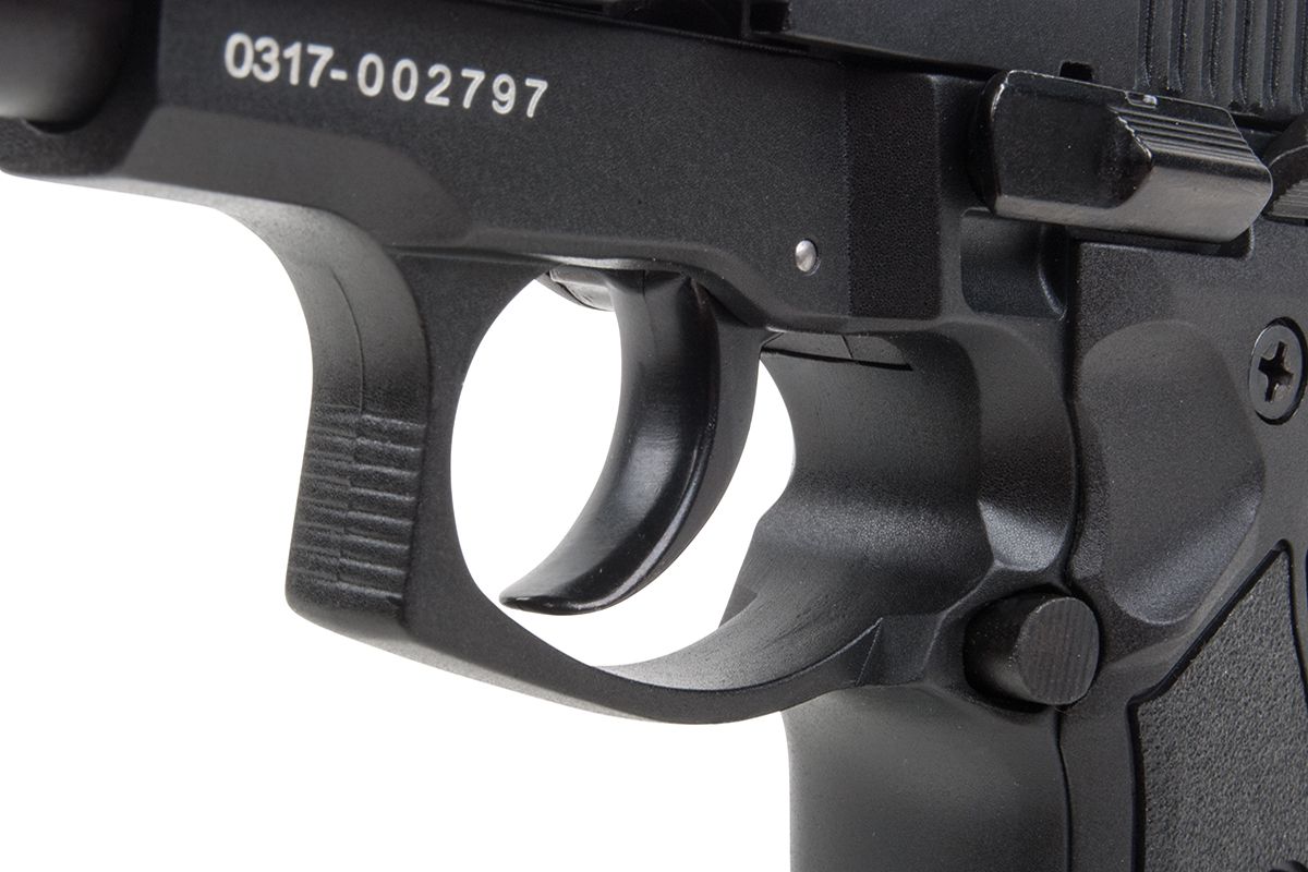 Die Pistole arbeitet im Semi-Automatik-Betrieb und ist mit einem Single-/Double-Action-Abzug ausgestattet. Eine manuelle Sicherung ermöglicht die kontrollierte Handhabung. Das Vollmetallgehäuse sorgt für ein solides Gewicht und ein ausgewogenes Handling. Die brünierte Oberfläche verleiht der Waffe eine klassische, widerstandsfähige Optik.