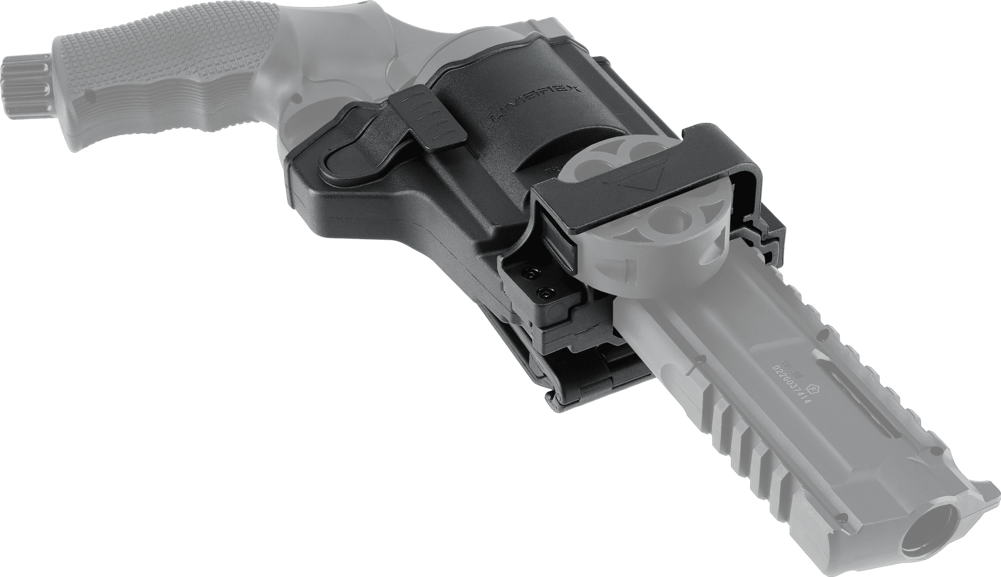 Passgenau konzipiert für den TR 68 / HDR 68, besteht das Holster aus stoß- und schlagfestem Polymer-Kunststoff. Der federgelagerte Release-Button ist intuitiv platziert, und die Gürtelaufnahme ist höhenverstellbar und lässt sich auf die passende Gürtelbreite einstellen. Ein Clip an der Außenseite bietet Platz für eine bereits vorgeladene Ersatztrommel.